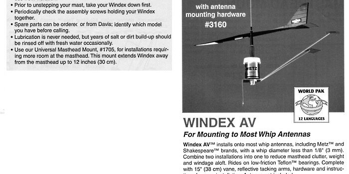 Windex Masthead Wind Indicators are the standard on mastheads around the world. Windex offers a wide range of masthead wind indicators well suited for racers and cruisers from 15′ (4.6 meters) to well over 100′ (30 meters). The newest member of the family, the WindeXL, features a 23″ (58.4 cm) vane…